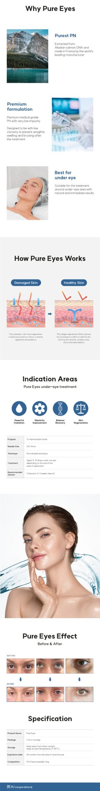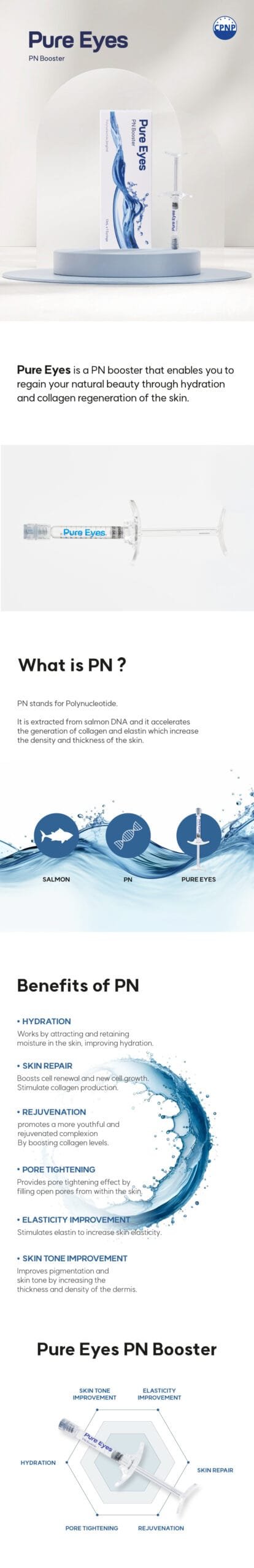 Pure Eyes is a PN skin booster designed for under-eye use to hydrate, regenerate collagen, and reduce dark circles. It promotes skin repair, elasticity, tone improvement, and pore tightening.